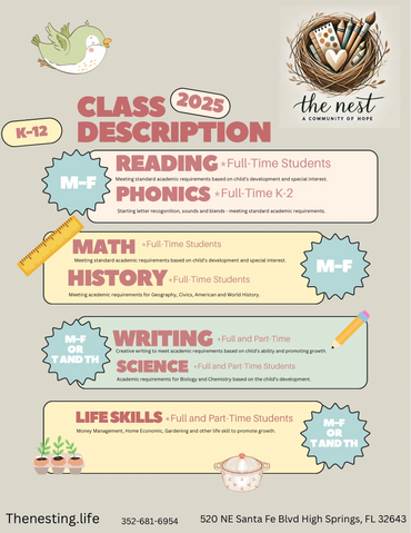 The Nest: A Community of Hope is a unique, trauma-informed homeschool model designed for neurodivergent children and their families. We provide a safe, nurturing environment where traditional academic subjects and social-emotional learning (SEL) are equally emphasized.